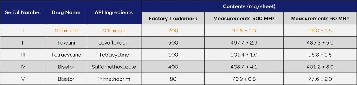 表 1 に、代表的な低分子医薬品 5 品目について、有効成分量の測定結果を示します。高磁場および低磁場核磁気共鳴装置で 1 次元 1H NMR スペクトルを収集し、クロロホルムを内部標準として 5 つの医薬品原料の有効成分量を定量しました。すべての分析対象薬物について得られた値は、高磁場分光器と卓上型の両者で得られたものが同レベルになりました。さらに、600 MHz と 60 MHz の両方の評価において製造番号 I の薬物の測定値はメーカーが主張する値の約半分となり、卓上型 NMR でも明確に低品質の製品を検出できることを示しています。
