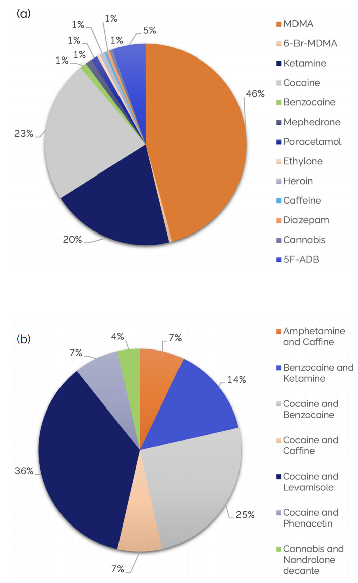 X-Pulseの薬物データベースとの比較照合により、400以上の疑わしいサンプルにさまざまな種類の薬物が含まれていることが判明しました。単一成分の化合物からなるストリートドラッグでは、エクスタシー (MDMA) 、コカイン、ケタミンが多く検出され、2成分の混合サンプルでは、コカイン/レバミゾール、コカイン/ベンゾカインなどの混合物が主に検出されました (Figure 2)。