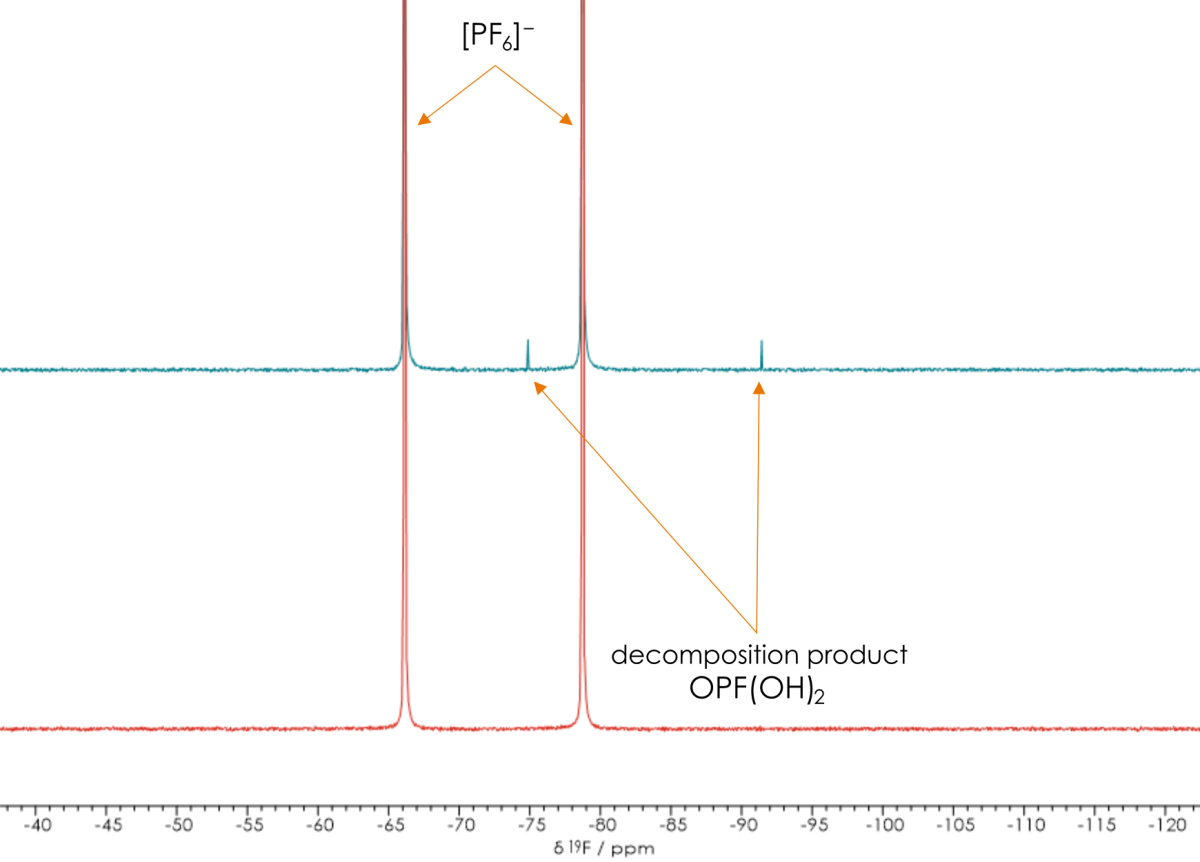 続いて、ヘキサフルオロリン酸リチウム塩に由来する電解質アニオンの解明を目指しました。そこで、フッ素のNMRスペクトルをとってみました。すると、すぐにスペクトルに違いがあることがわかりました。ヘキサフルオロリン酸のリンにフッ素が結合することで、結合スペクトル上にダブレットを引き起こしていました。