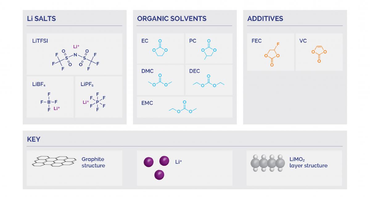 塩を有機溶媒(ジメチルカーボネート、エチレンカーボネート)に溶かします。これらには、その電解質の性能を向上させるための添加剤が含まれている場合もあります。