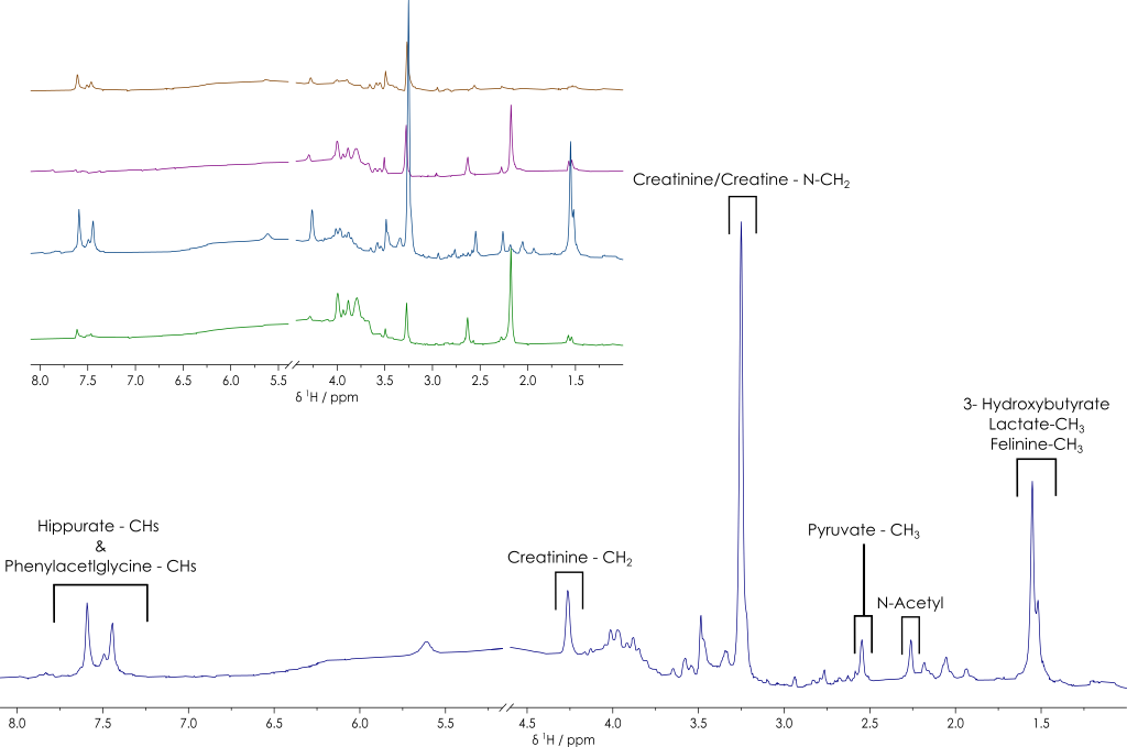 図 1:主要代謝物であるネコ尿の 1H NMR スペクトル。左上は、同研究において得られた同様の 4 つのスペクトル。