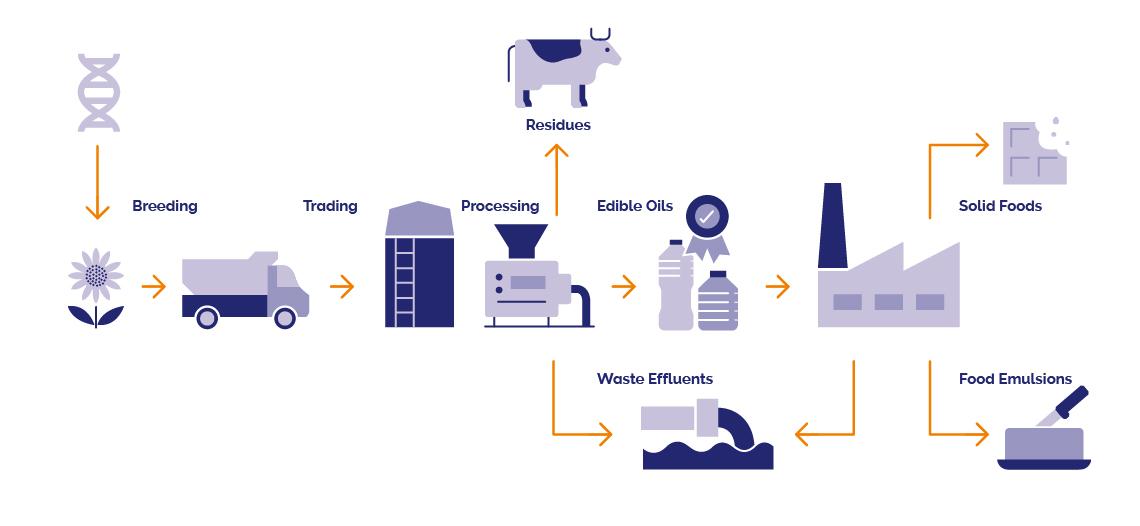 油脂の測定は、収穫から原材料の加工、食品の製造にいたるまで、フードチェーン全体において、製品の歩留まりと品質を向上させるために必要とされています。TD-NMR(時間領域NMR)や卓上型NMR分光計は、下記に示すそれぞれの重要な工程を最適化することができます。(数字をクリックすると、詳細をご覧いただけます。)