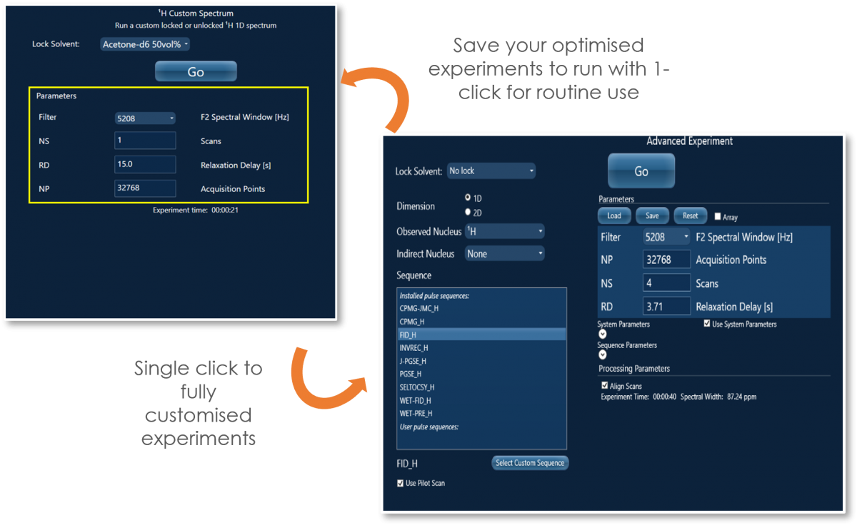 X-Pulse 卓上型NMRのデータ収集は、当社独自の汎用性の高いSpinFlowソフトウェアで制御されています。このソフトウェアでは、ワンクリックで実験を実行したり、すべてのパラメータをカスタマイズして必要な実験を正確に行うことができます。詳細はこちら。