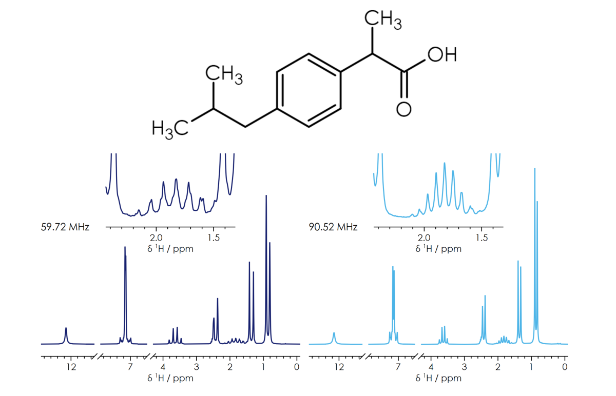 詳細はこちらX-Pulse 90 は、90 MHz(2.1 T)の磁場強度により、複雑なピークの重なりを分離し、サンプル中の目的化合物を正確に特定できます。磁場強度の向上により、低磁場では区別が難しかったピークが分離され、識別が容易になりました。