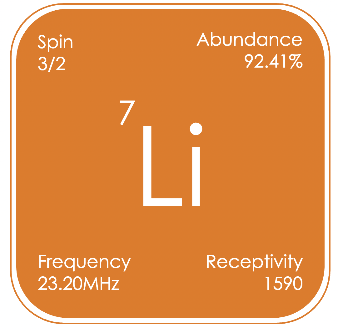 リチウムを含む化合物は有機金属化学において重要な試薬です。リチウムは医薬品に使用されているものの、生物学的な役割はあまり知られていません。リチウムはエネルギー貯蔵システム(バッテリー)への用途が急速に拡大しており、リチウムイオン電池に使用されるLi+カチオンを含む溶液はNMR分光法による研究に適しています。⁷Liは四極子核であり、線幅は分子の対称性や大きさに強く依存します。⁷Liの信号は、δLi +15~-20 ppmの範囲に観測されます(基準:D₂O中のLiCl)。
