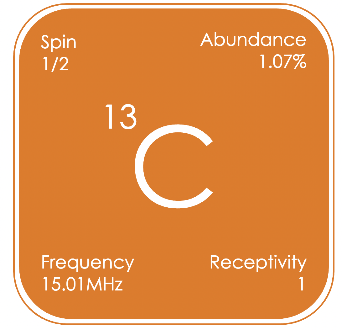 ¹³Cは、有機化学や生命科学における炭素の重要性から、NMR分光法では¹H に次いで多く研究されている原子核です。しかし、¹³CはNMR活性核種の中でも相対感度が最も低い核種です。そのため、炭素がこれほどまでに存在していなければ、¹³C NMRはNMR分光法でここまで研究されることはなかったかもしれません。¹³C NMRスペクトルは、通常、プロトン(¹H)と炭素(¹³C)のカップリングによるピークの分裂を除去する、デカップリングと呼ばれる手法を用いて、スペクトルを大幅に単純化し、S/N比を向上させています。有機低分子化合物の多くは、¹H をデカップリングした¹³C NMRスペクトルを生成し、その化学シフトはδC 0~+200 ppmの範囲(基準:CDCl₃ 中の (CH₃)₄Si)にシャープなシングレットピークとして観測されます。