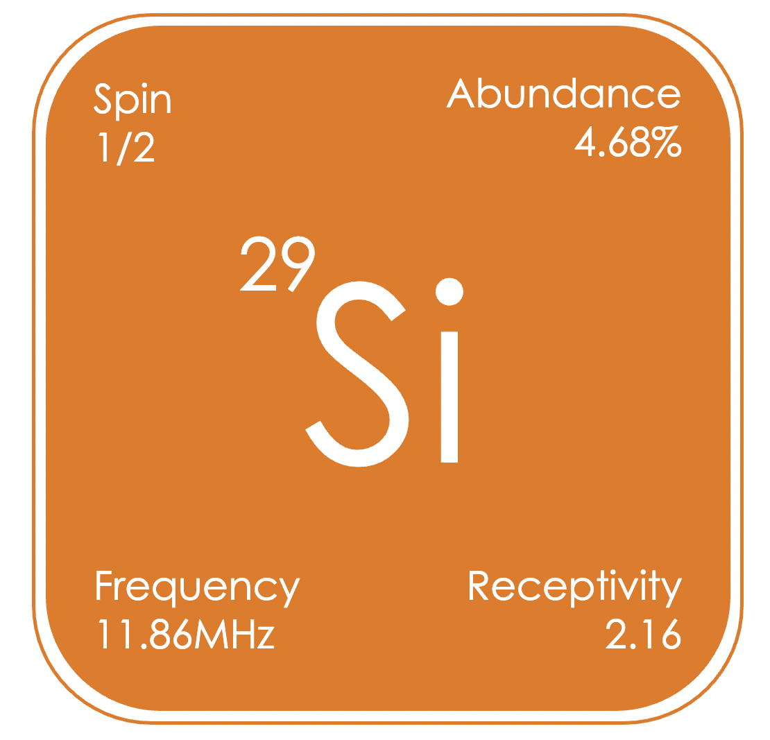 ²⁹Si NMR分光法は、接着剤、潤滑剤、シーリング剤などのアプリケーションがあり、医療や家庭でも使用されているポリシロキサン(シリコーン)とそのモノマー前駆体の分析などにも有用です。²⁹Siは相対感度が低い核であり、NMR信号は、δSi −350〜+175 ppm(基準:(CH₃)₄Si)の範囲に観測されます。²⁹Si NMRの感度向上には、¹³C NMRで使用されている方法が適用できます。例えば、DEPT(Distortionless Enhancement by Polarisation Transfer)などのパルスシーケンスを用いて、²⁹Si核ではなく、感度の高いプロトン(¹H)を励起する方法があります。
