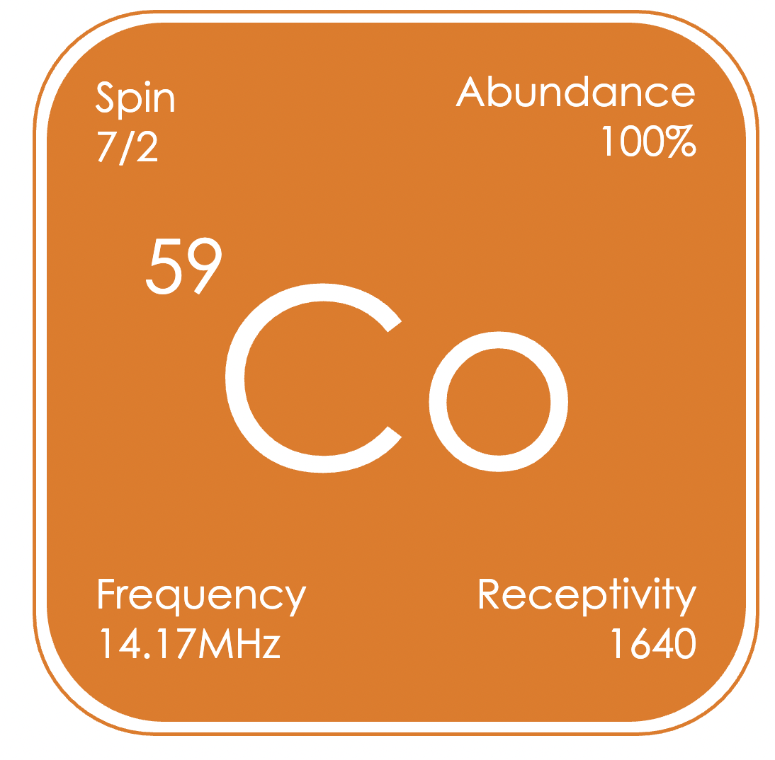 ⁵⁹Coは、異なる化合物の化学シフトの変化が初めて観測された核として、NMR分光法の発展に重要な役割を果たしました。コバルト化合物の多くは常磁性体であるため、⁵⁹Co NMR分光法が適用されるのは一般的に低スピンのコバルト(Ⅰ)およびコバルト(Ⅲ)錯体に限られます。⁵⁹Co の信号は、δCo −4,000〜+14,000 ppm(基準:D₂O中のK₃[Co(CN)₆])の範囲に観測され、化学シフトの範囲が最も広い核となっています。